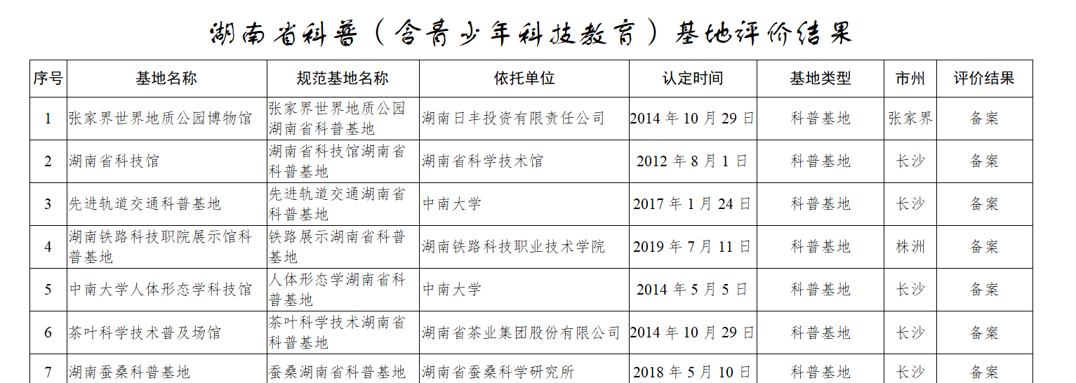 根据《湖南省省级科学技术普及基地管理办法》(湘科发〔2021〕143号)、《关于开展湖南省科普(含青少年科技教育)基地绩效评价工作的通知》