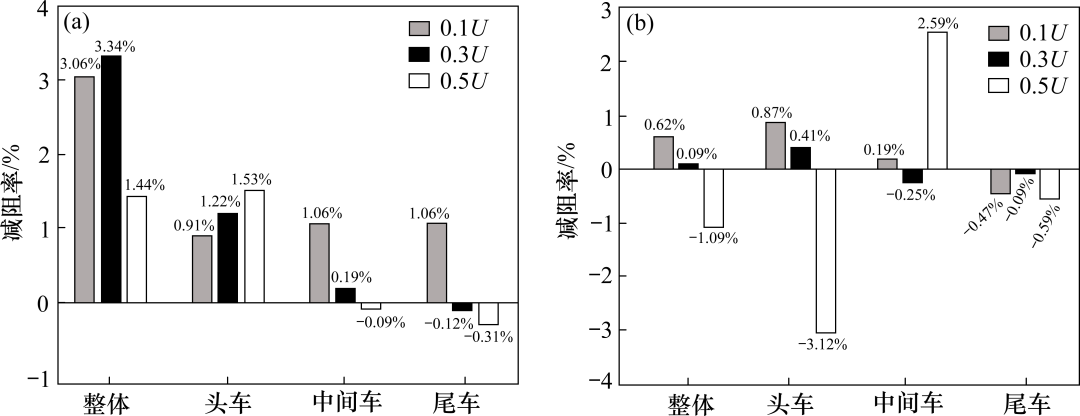 不同喷气部位气动阻力分析。为比较头车流线型与等截面车身过渡位置和等截面车身喷气的减阻效率差异,在流线型头部过渡位置顶面设置了和等截面车身顶面相同的喷气口,两者分别以0.1U喷气时整车及各节车减阻率对比如图5所示。