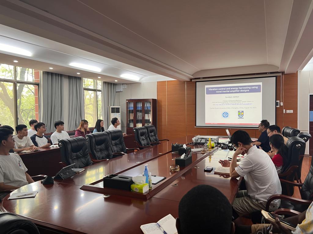 据刘项报:2023年8月16日,英国格拉斯哥大学詹姆斯·瓦特工程学院:Sondipon Adhikari教授在高速列车研究中心北楼201会议室做《采用新型惯性放大器设计的振动控制和能量收集》主题报告。报告中Sondipon Adhikari教授首先介绍了传统的惯性放大器,随后提出并分析了新形式的惯性放大器设计的结构与特点,最后通过分析基础机构的动力学,以封闭形式导出了所有放大器的质量和刚度放大因子。基于解析表达式,解析获得了最佳放大的参数选择。数值结果表明,实现几个数量级的质量和刚度放大是可能的。报告中提出和设计的惯性放大器将提供更高的有效质量和刚度,使得利用基础振荡系统的共振频率能力得到的被动振动控制效果更优越。