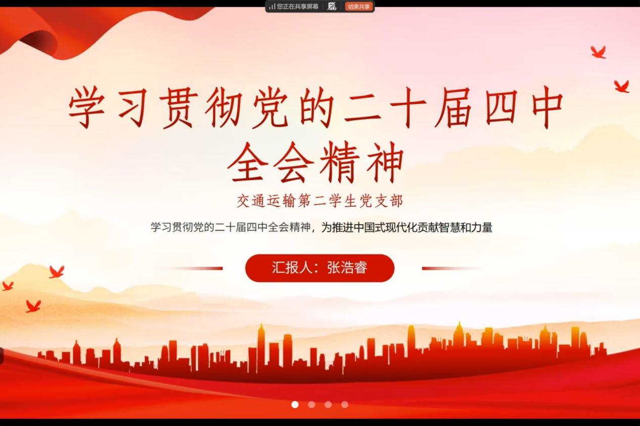 交通运输第二学生党支部于线上召开学习党的二十届四中全会精神专题研讨交流会,支部书记王尚君同志主持会议。
