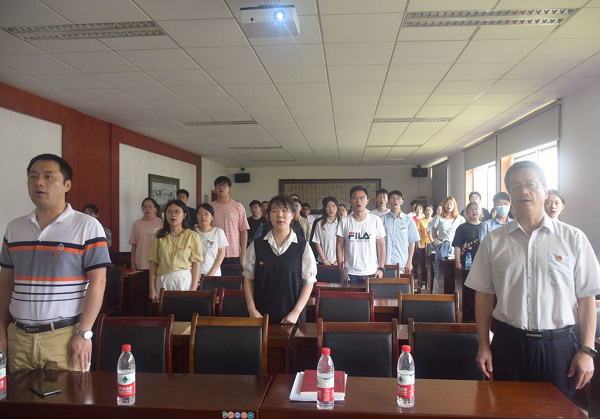 会议伊始,张佳琪同志简单介绍了会议流程,紧接着全体起立,奏唱国歌,全体党员同志以及预备党员在贺书记的带领下宣读入党誓词。